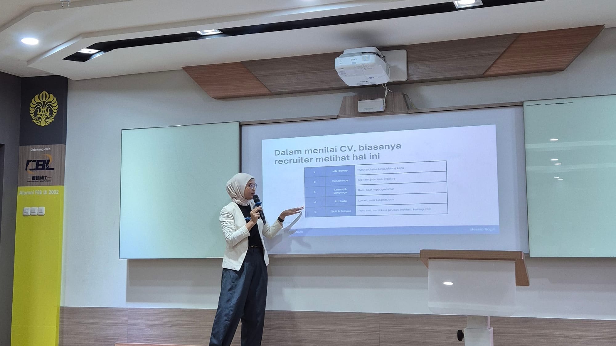 Pada sesi pertama, Nessia memaparkan materi seputar penyusunan CV yang efektif. Menurutnya, peran CV bukan hanya dokumen informasi, tetapi strategic marketing tool yang membantu recruiter melihat potensi kandidat dalam waktu singkat.